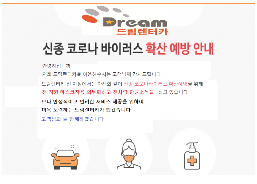 최근 코로나19 확진자가 급증함에 따라 코로나19 예방을 위해 저희 드림렌터카에서는 기본수칙을 잘 지키고자 합니다